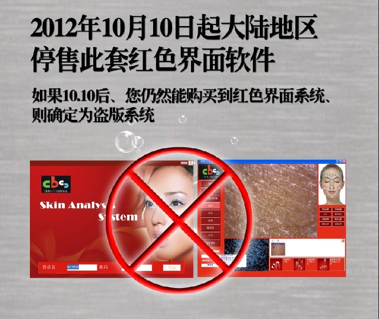 如果您在10月10日之后仍然看見(jiàn)有商家在宣傳或銷售紅色版本的CBS皮膚分析系統(tǒng),則一定是盜版!盜版軟件會(huì)導(dǎo)致分析數(shù)據(jù)的嚴(yán)重偏差以及可能對(duì)使用者的電腦及其他設(shè)備的硬件和系統(tǒng)造成不利影響,因此而導(dǎo)致相關(guān)損害。我公司對(duì)此不負(fù)任何法律責(zé)任。